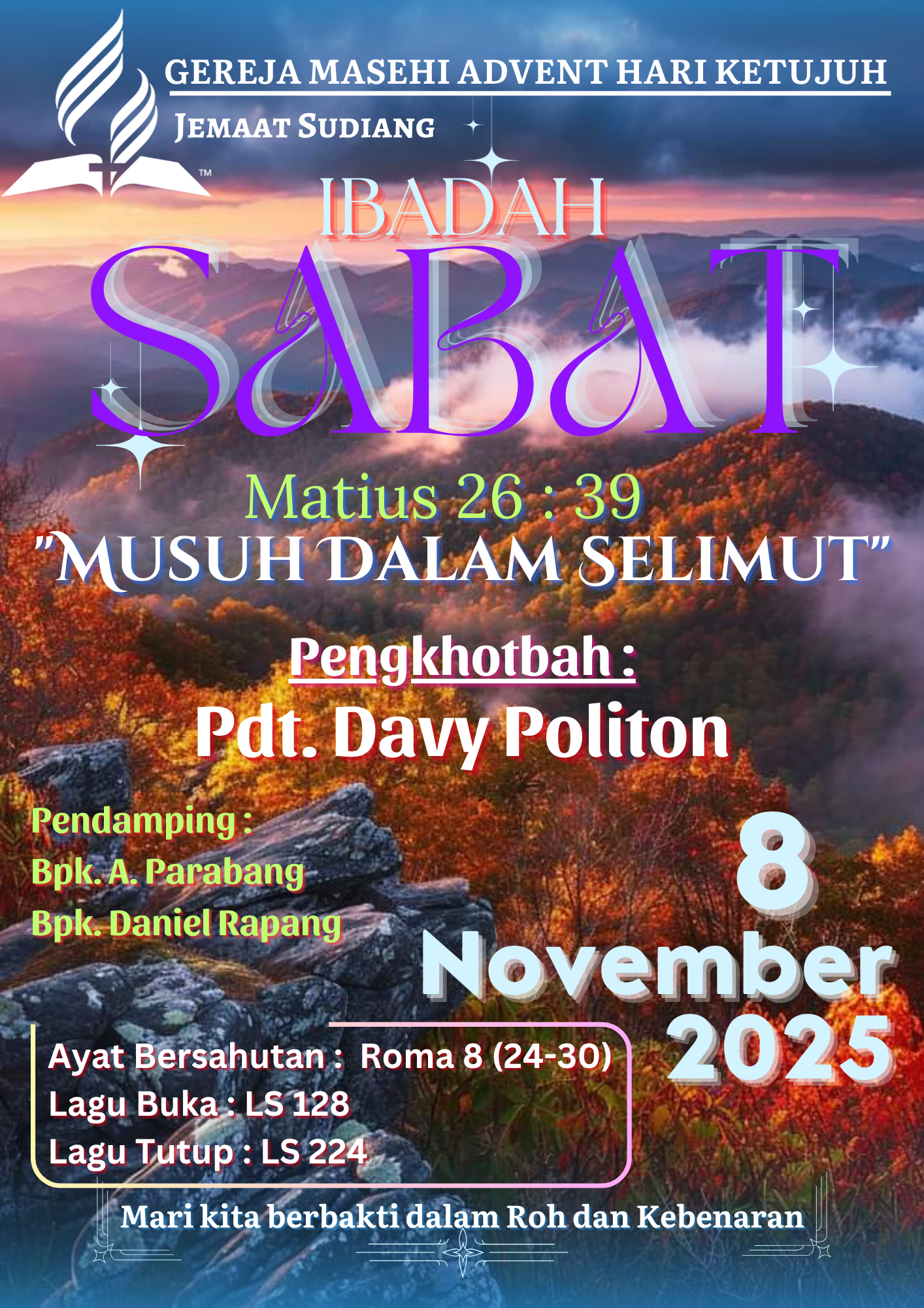 Pelayanan Ibadah Hari Sabat tanggal 8 November 2025, acara dimulai pukul 08:30 WITA. #gmahksudiang #sabat #gerejamasehiadventhariketujuh #jemaatsudiang
