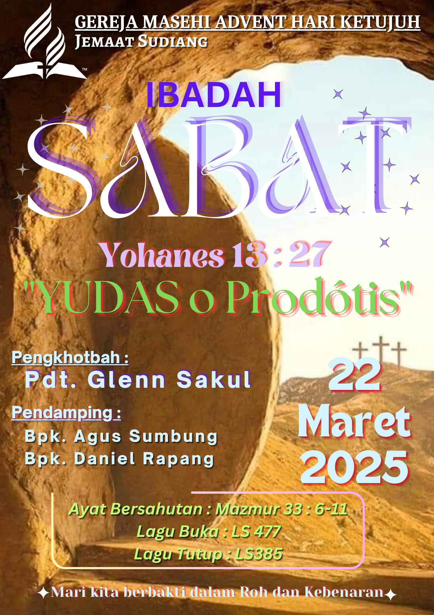 Pelayanan Ibadah Hari Sabat tanggal 22 Maret 2025, acara dimulai pukul 08:30 WITA. #gmahksudiang #sabat #gerejamasehiadventhariketujuh #jemaatsudiang