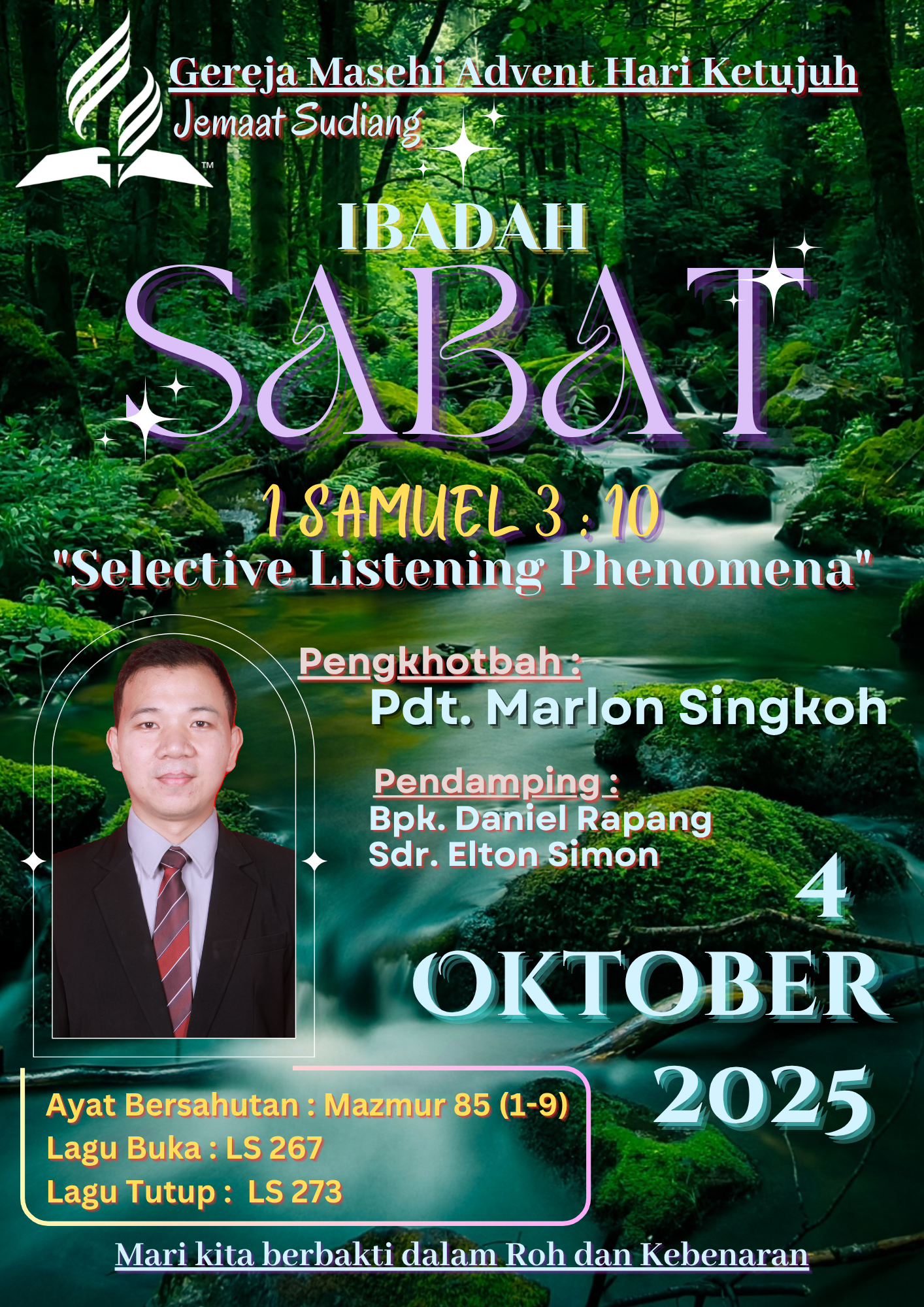 Pelayanan Ibadah Hari Sabat tanggal 25 Oktober 2025, acara dimulai pukul 08:30 WITA. #gmahksudiang #sabat #gerejamasehiadventhariketujuh #jemaatsudiang