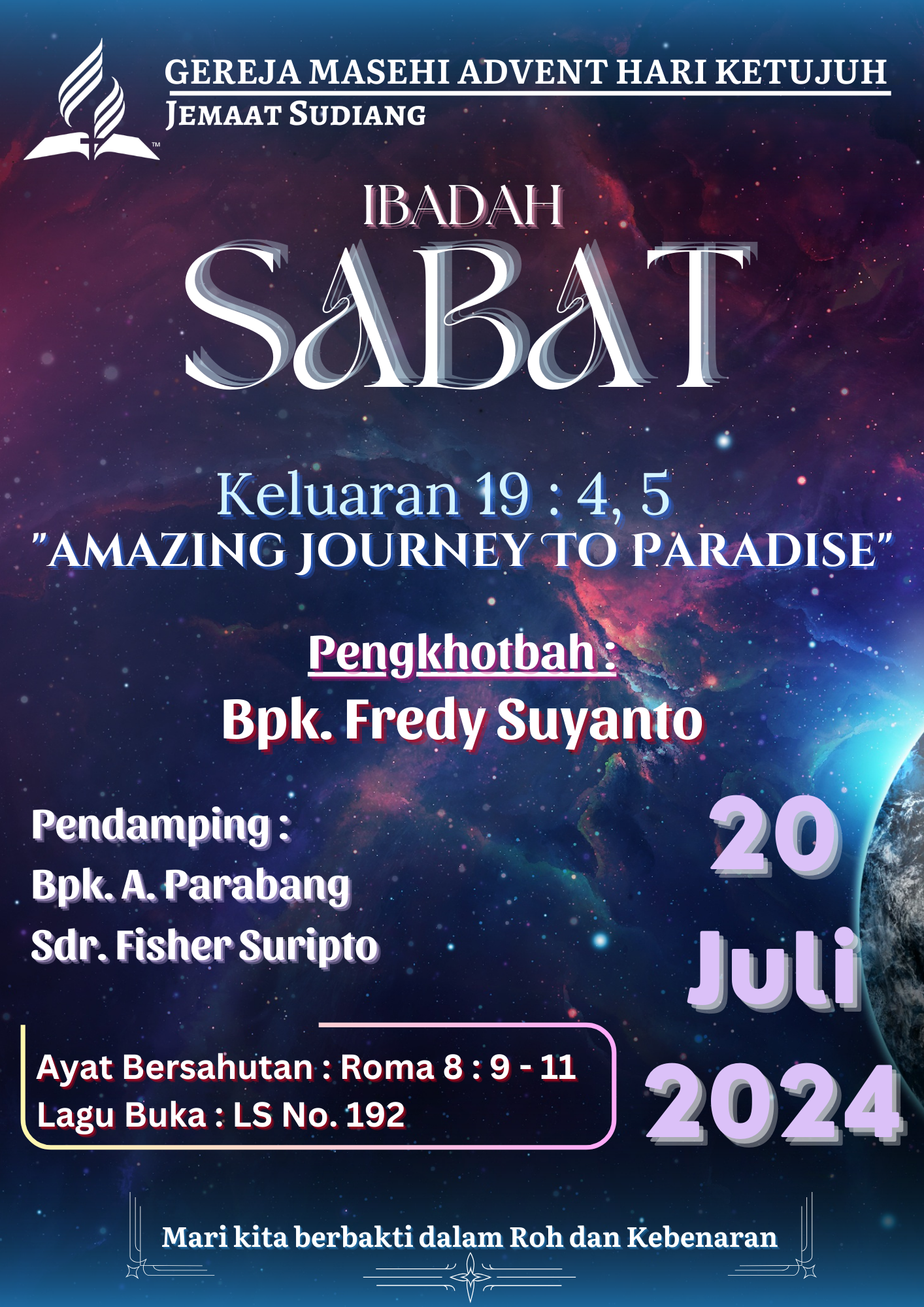 Pelayanan Ibadah Hari Sabat tanggal 20 Juli 2024, acara dimulai pukul 08:30 WITA. #gmahksudiang #sabat #gerejamasehiadventhariketujuh #jemaatsudiang